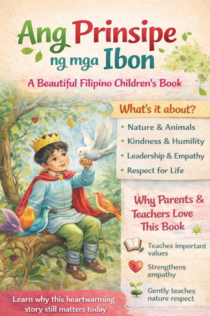 Ang Prinsipe ng mga Ibon is a Filipino children’s book about a young prince who grows up surrounded by birds and nature. Through his experiences, he learns important values such as kindness, humility, empathy, and respect for life. The story focuses on emotional growth rather than power or wealth.