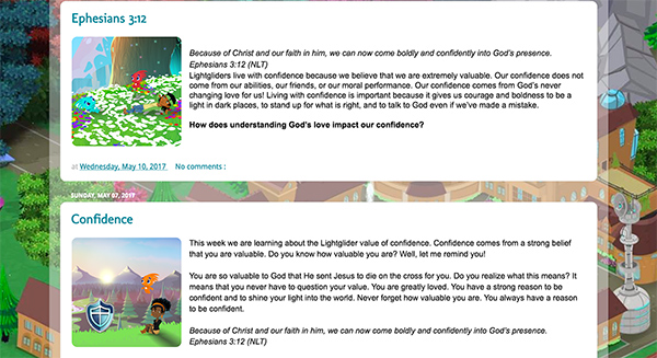 At the same time, parents can also stay connected through the parent’s blog. In this section, they can see what the children are learing every week. Discussion questions are also being provided which is integrated with the gameplay to begin conversations around things like faith, values and important life lessons.