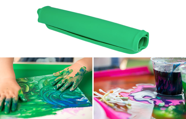 Messmatz is a non-toxic, food-grade silicone activity mat, safe to play on and even eat off! There is a soft and flexible perimeter lip, which is great for containing messes or spills and will leave your surface protected. It’s large in size (24” x 18”) and even comes in three colors: pink, green, and blue!